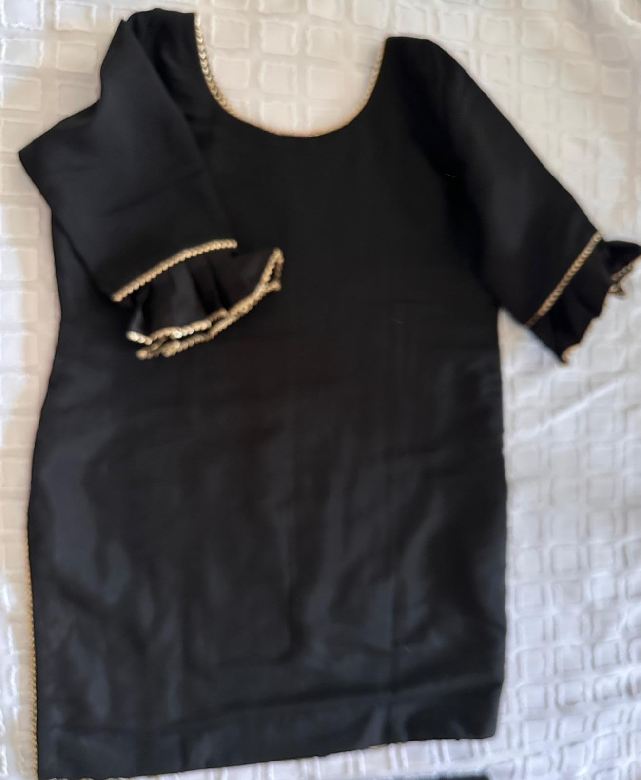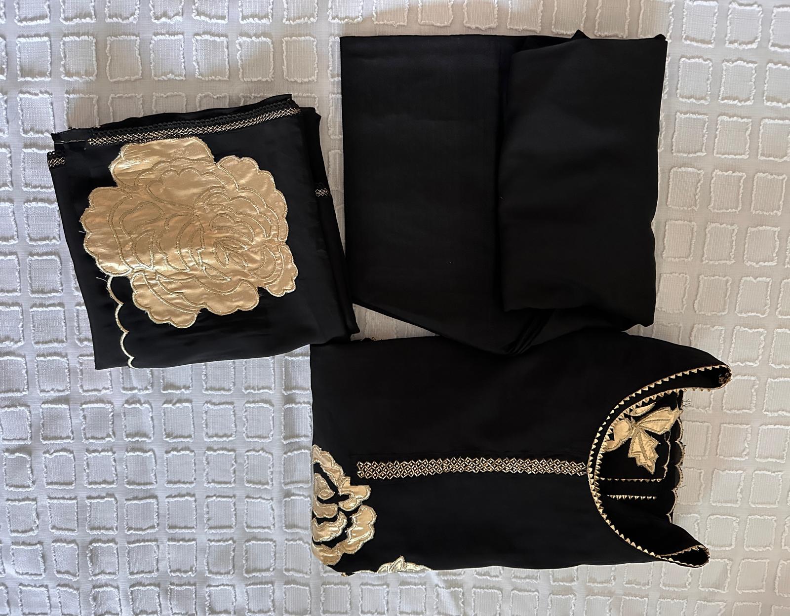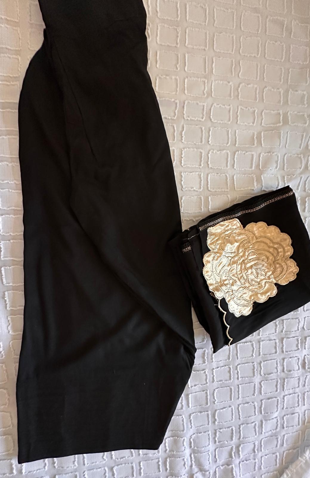 Crafted with meticulous attention to detail, this custom Farshi salwar presents an elegant fusion of traditional embellishment and refined tailoring. Cutdana and bead work adorns the neckline, while gota patti embroidery graces the sleeves with understated luxury. The dupatta showcases gold zari lacework, and striking floral patterns command attention for special occasions. Softly pleated sleeves add dimension and grace. Designed for a 41" bust with adjustable seams for personalized fit, this piece combines heirloom craftsmanship with wearable sophistication. This is Maslin fabric! look stunning in Black!