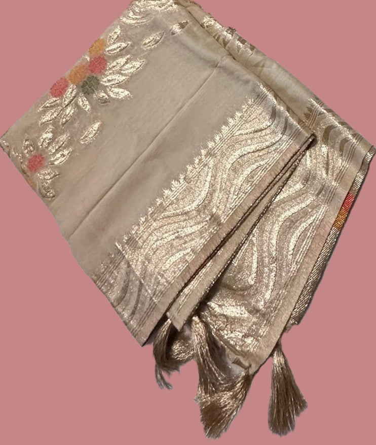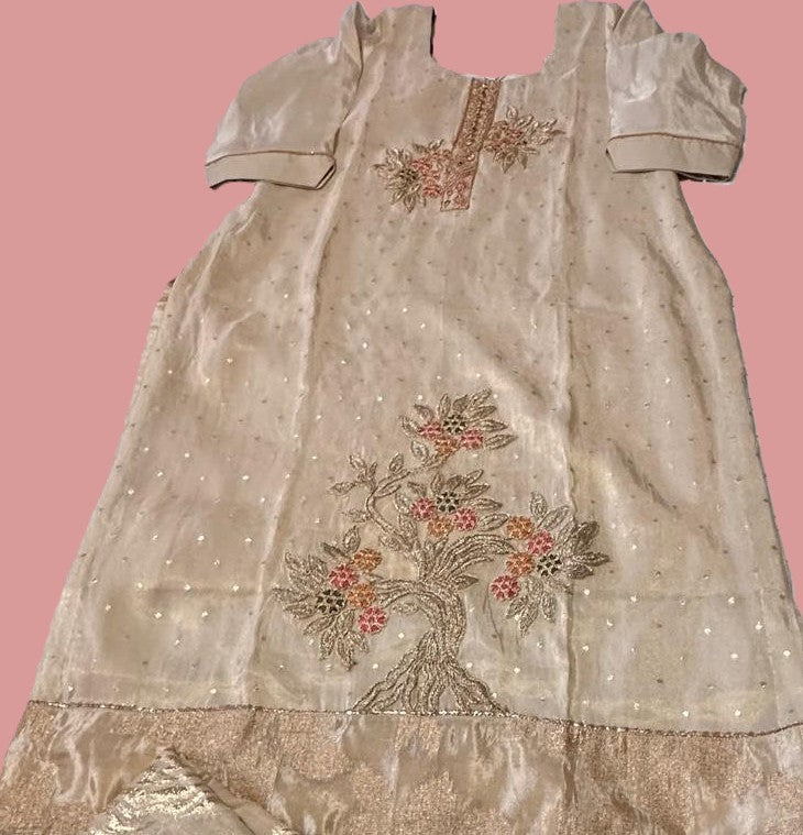 Discover timeless elegance with this bespoke straight suit, meticulously tailored from sumptuous Banarsi silk. Hand-embellished with lustrous gold jari threadwork accented by rich green, mustard, and pink hues, the intricately detailed shirt front features delicate butties and ornamental dori at the neckline. The coordinating dupatta showcases exquisite gota pati embroidery with traditional latkans at each corner. Tailored straight pants feature refined side buttons and piping, cut to a 37-inch length with a graceful 9-inch bottom flair. Expertly proportioned for a larger frame with precisely measured sleeves and neckline. A sophisticated statement piece for discerning occasions. Sleeves-16.5 Front neck-8 and back neck-10.5 deep. Latkans and dori on teh back.