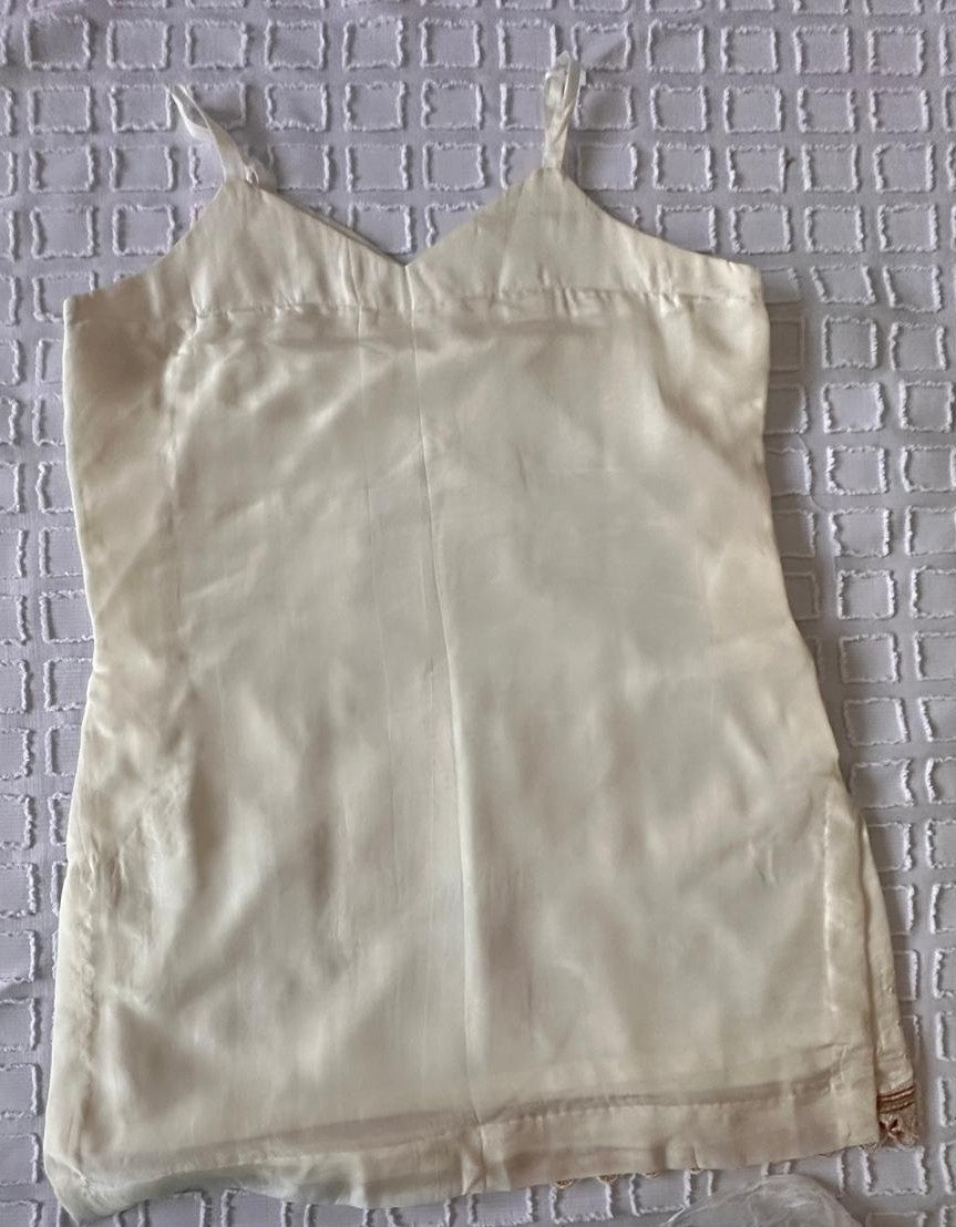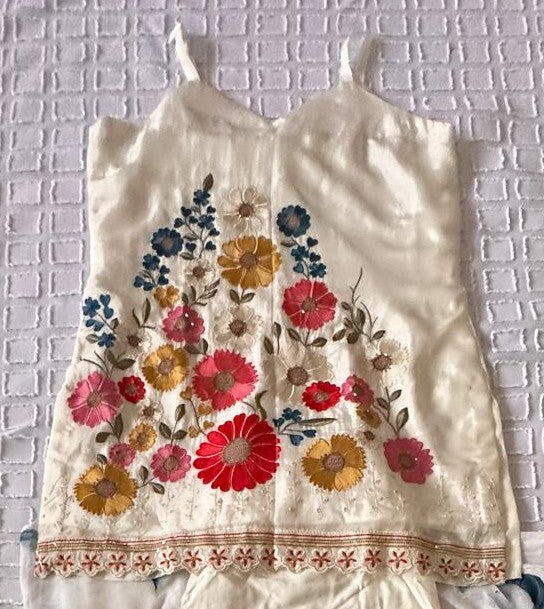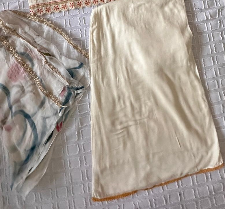 Elevate your wardrobe with this bespoke crepe silk plazzoo suit, crafted in soft crepe with an off-white base adorned with hand-painted floral patches in blue, mustard, red, and pink. Delicate spaghetti straps frame the fitted bodice (bust 38/39, length 32). The coordinating duppatta features matching hand-painted florals, while the palazzo complements the ensemble with its flowing silhouette, mustard lace border detail, and generous 19.5-inch flare (size 39). A refined piece that celebrates artisanal craftsmanship and timeless elegance.