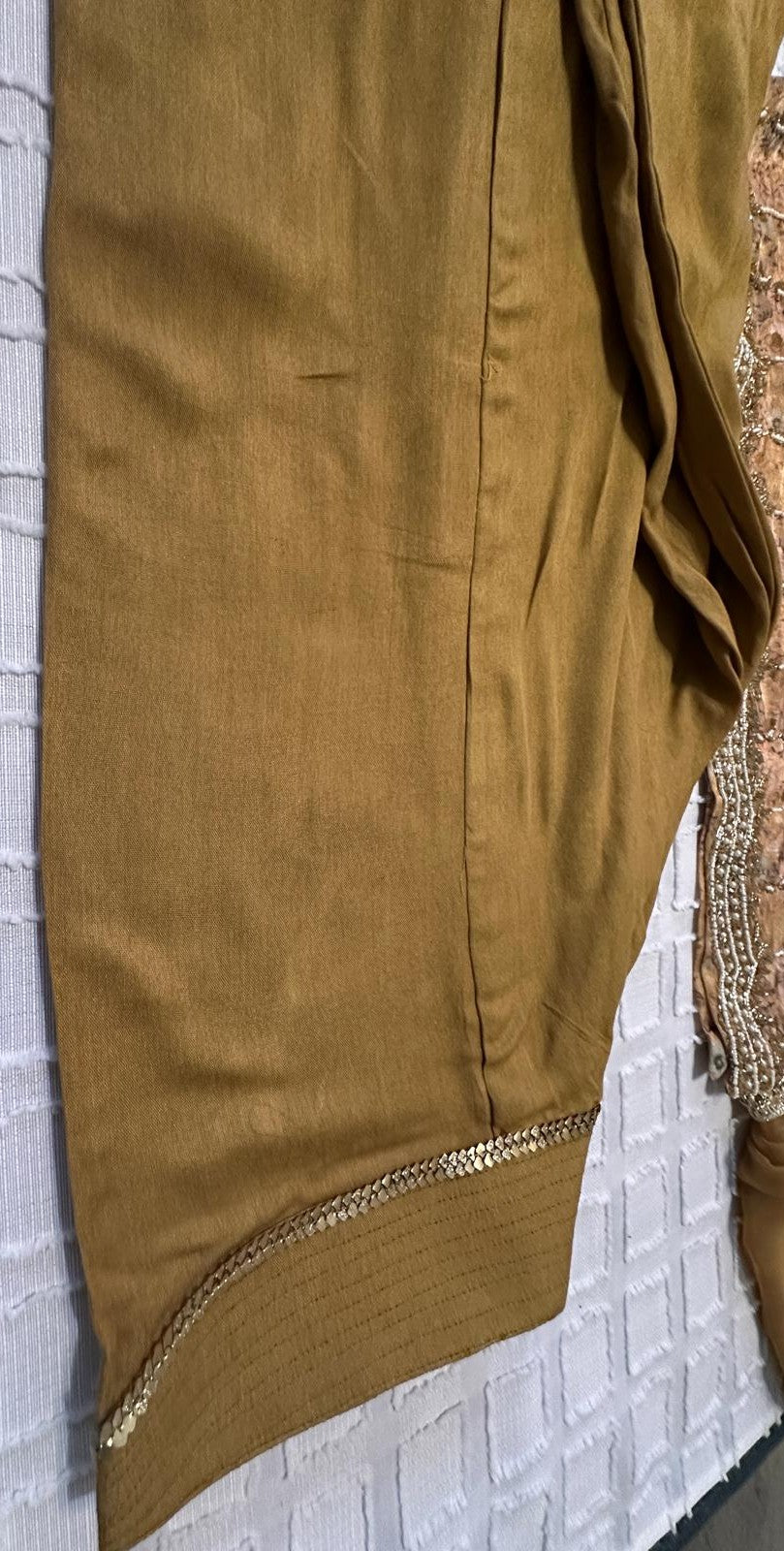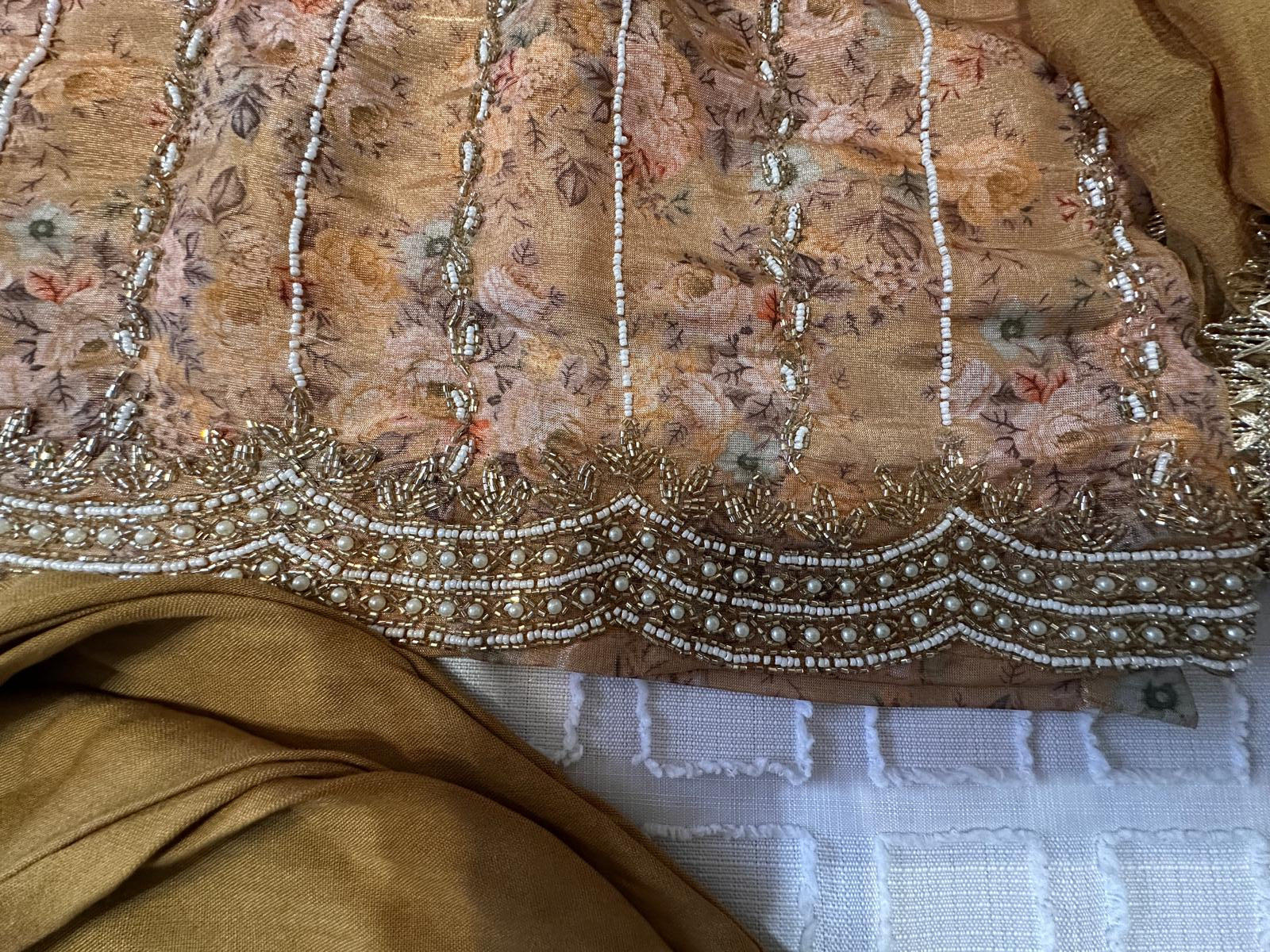 This bespoke salwar suit showcases artisanal mastery through shimmering muslin adorned with intricate cutdana and pearl embellishments. The tailored shirt presents delicate beadwork across the front and pearl detailing along the sleeves, while the mustard salwar features ornate golden lace at the hem. The coordinating duppatta is finished with gold zari lacework throughout its border. Expertly constructed in a medium fit with precise proportions—shirt length 42", bust 39", sleeves 16", front neck 6.5", back neck 7", and salwar length 38"—this piece embodies timeless elegance and refined craftsmanship for the discerning wearer.