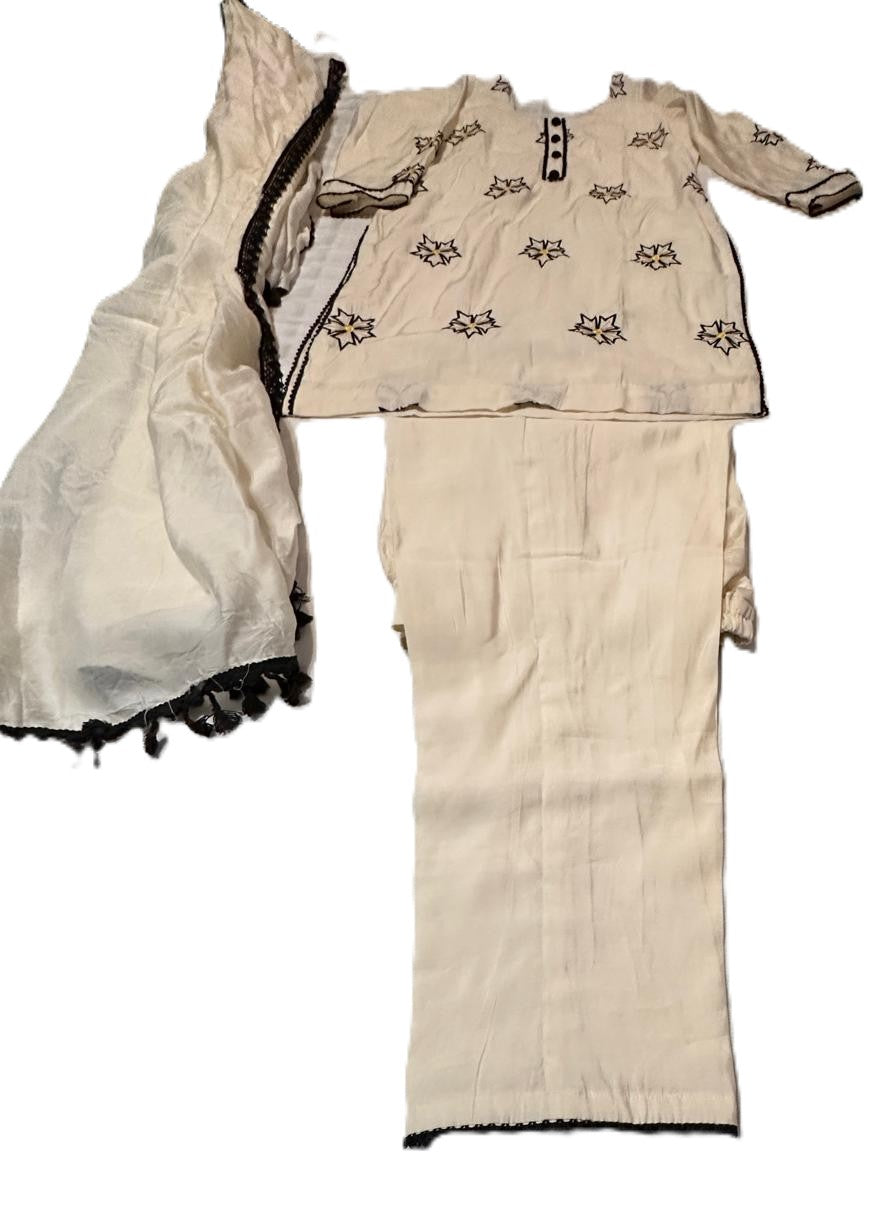 Elevate your ethnic wardrobe with this stunning cream and black ensemble that commands attention. The maslin front features intricate black floral embroidery accented with vibrant yellow threadwork, while full sleeves (19") showcase delicate lacework. Paired with plain cream pants trimmed in black lace, the coordinating dupatta wraps the look in sophisticated black lacework and tassels. Generously cut at the bust (42") with a 38" shirt length, this piece flows beautifully from daily wear to celebrations—drape it traditionally or style as a kurti with leggings. Designed for comfort and grace at temple visits, family gatherings, and special occasions. Front neck depth 7.5", back neck 8". Note: Colors may vary slightly due to lighting and photography.