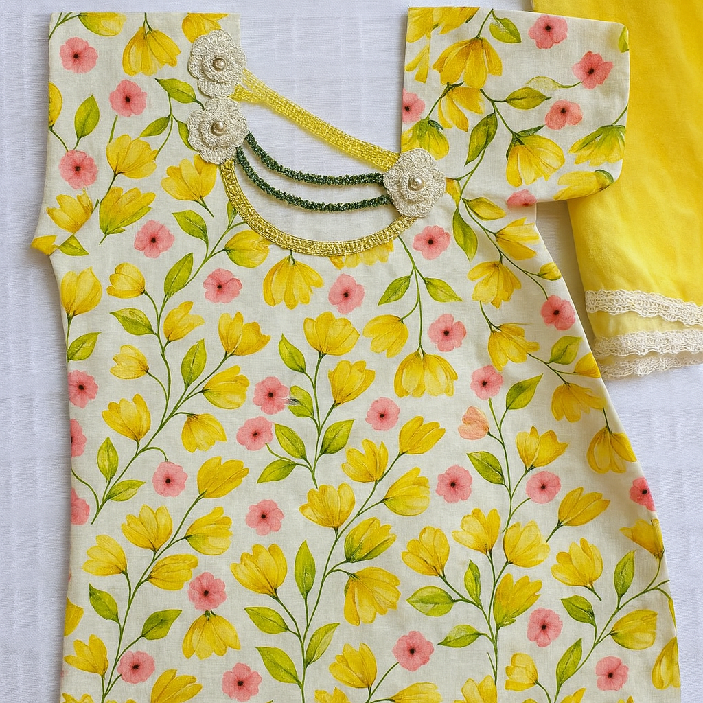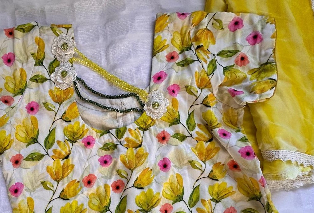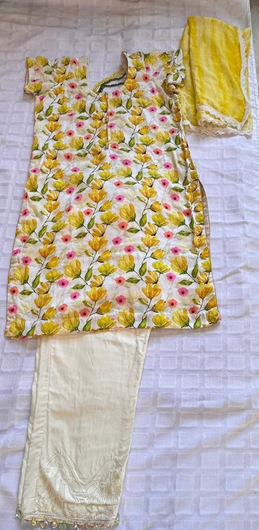 Crafted in luminous Maslin with delicate white embroidery, this straight pant suit marries contemporary silhouette with timeless sophistication. Tailored for size Medium with a 39-inch bust and 36-inch pant length, the piece features refined proportions: a 39-inch shirt length, graceful 6-inch sleeves, and an 8-inch flared hem. Versatile by design, it transitions seamlessly from temple visits and family gatherings to intimate celebrations—or reimagine it as a kurti paired with leggings for modern versatility. An investment in understated elegance that honors tradition while embracing personal style. Please note: color may vary slightly due to photography and lighting conditions. Medium 38Shirt Lenght-39, Bust-38/39, Front neck-7.5, Beck neck-9. Sleeves 6, Straight Pant Length-36 with 8inches wide fliar,
