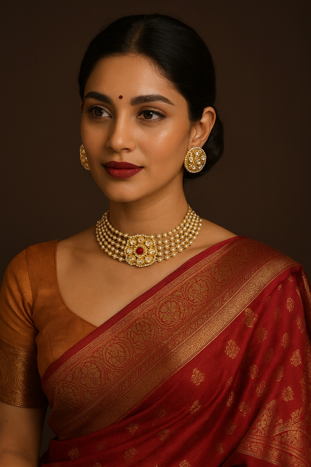 Enhance your ensemble with the Jhansi Kundan necklace set, an ideal match for sarees or minimalist suits. Its refined all-white with Ruby stone in the middle design seamlessly blends with diverse wardrobe choices. Suitable for both traditional Indian garments and contemporary Western styles, this versatile accessory guarantees a graceful and distinguished appearance. Crafted from polished alloy with glass stones, it offers an authentic look at an affordable price. Lightweight and budget-friendly, it is perfect for both festive occasions and everyday elegance.