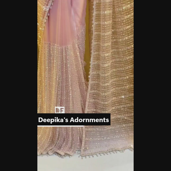 MOTI HANDWORK LACE AND INTRICATE SILVER SEQUENCE PURE NET SAREE. Experience the graceful shimmer of this net saree as it moves with you. Crafted in delicate blush pink georgette, it exudes refined elegance, subtle glamour, and effortless flow.