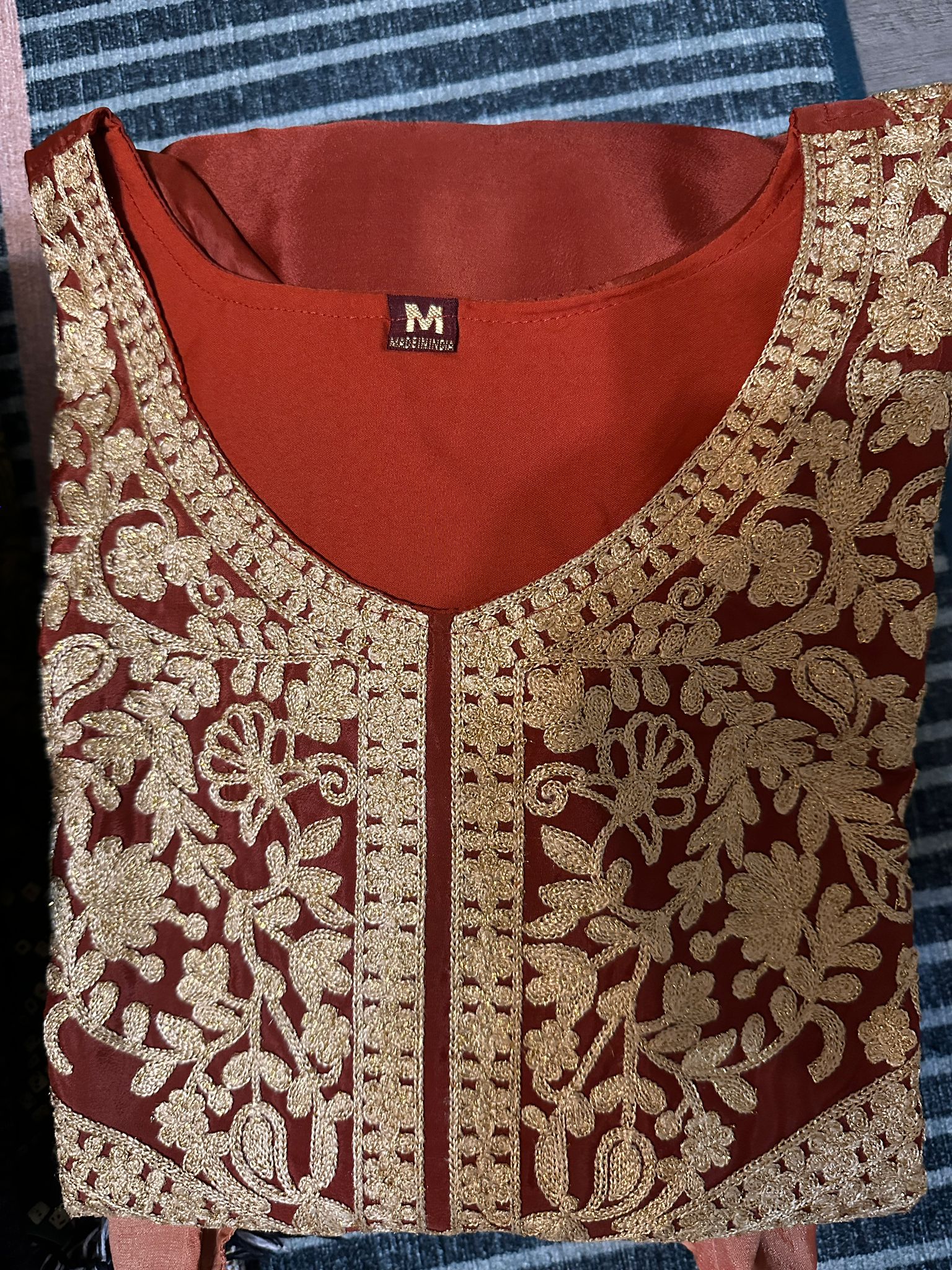 Plazzo suit in rust color with gold embroidery all over. Heavy dupatta.